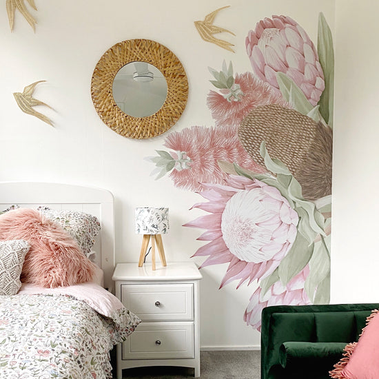 This beautiful Protea, Bottlebrush and Banksia wall mural is the perfect way to add a a stunning Australian native feel to any room or nursery. This extra large flower mural is bigger than our standard wall decals without the cost of wallpaper, making it the perfect 'in between' choice. See application video HERE!